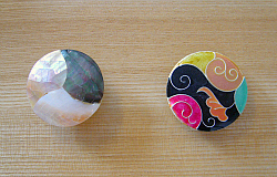 七宝特有の艶やかな表面に、大胆な色の配色で目をひく帯留です。