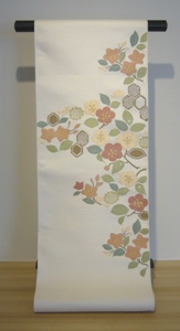 さらっと涼しげな地色に、大胆な色使いの花が描かれた、何とも都会的でモダンなデザインの帯です。