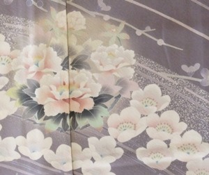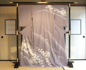 グレーがかった紫地に花々が流れるように配された幻想的な雰囲気の訪問着です。