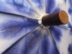 藤井絞の浴衣で有名な雪花絞りですが、モダンな意匠に染め出した、万華鏡のような花柄を傘布に用いています。柄の滲みと白地のコントラストが、強い日差しを跳ね返してくれるようです。