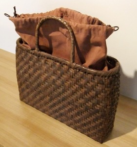 また、内側は柿渋染めの巾着袋で仕切られているので、入れたものを傷つける心配がなく、