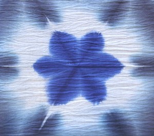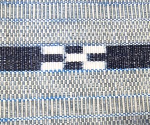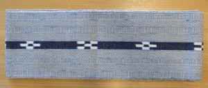 草木染めの優しい水色にミンサー織特有の四つ玉、五つ玉と呼ばれる絣柄が入っています。