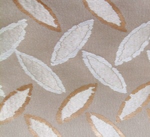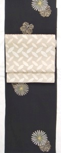 チャコールグレーと相性抜群のベージュ地に、七宝繋ぎを崩したような意匠が印象的な洒落感のある帯です。