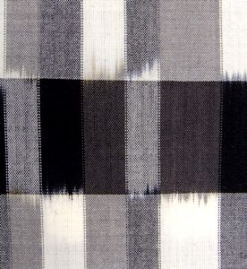 白黒チェックのシャツのような経絣のウール着尺反に、絣に似た技法で織られるインドネシアの織り物「イカット」の