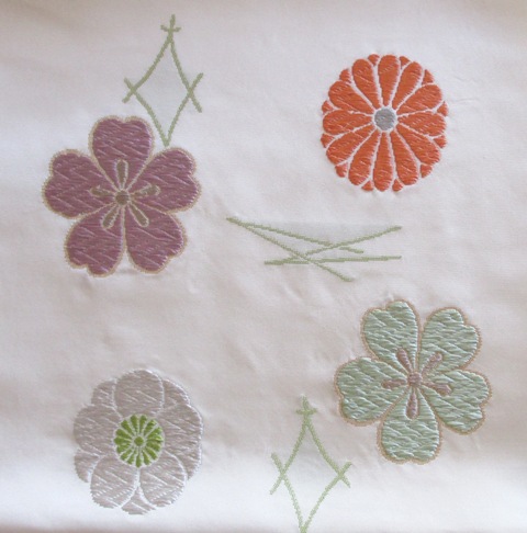 薄いピンクと水色、金糸の糸で施された白い帯地のバッグを選びました。バッグの刺繍と花模様