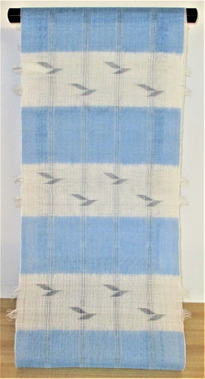 鳥取青谷在住の染織作家、山下健さんの夏の定番、生絹の帯です。「生絹(すずし)」と呼ばれる精錬していない生糸を用いて織り出された帯は、麻のようなごわごわとした質感で、繊細な表情とは裏腹に締めやすい帯です。随所に透かしが入り、九寸ですから帯芯を入れて仕立てるのですが、ほのかな透け感はそのまま持続します。夏らしい浅葱色が段替えに染め分けられ水羊羹のような配色が、着用されるご本人のみならず街を行き交う人にも涼感を与えます。また、所々に配されている矢絣が程よいアクセントとなり、静謐な中にもリズミカルな動きの要素が取り込まれた味わい深い帯です。こんな帯であれば、うだるような暑さであってもなんのその、涼やかな気分で外出したくなりますね。