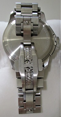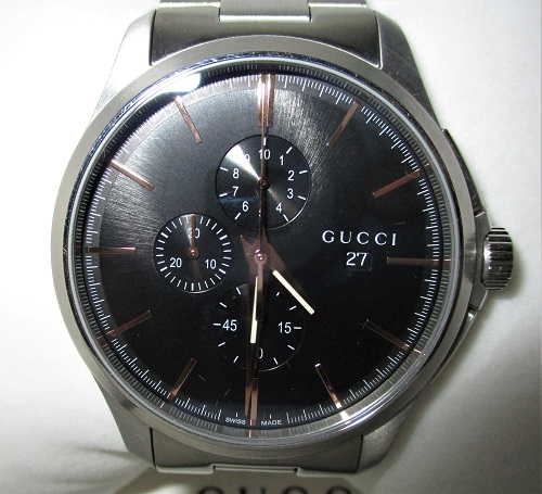 黒文字盤にピンクゴールドの指針が映えるグッチの時計です。暗い場所でも時間が分かるよう指針には蛍光塗料が塗られており、日付、1/10秒計、60秒計、30分計がついていて機能も充実しています。